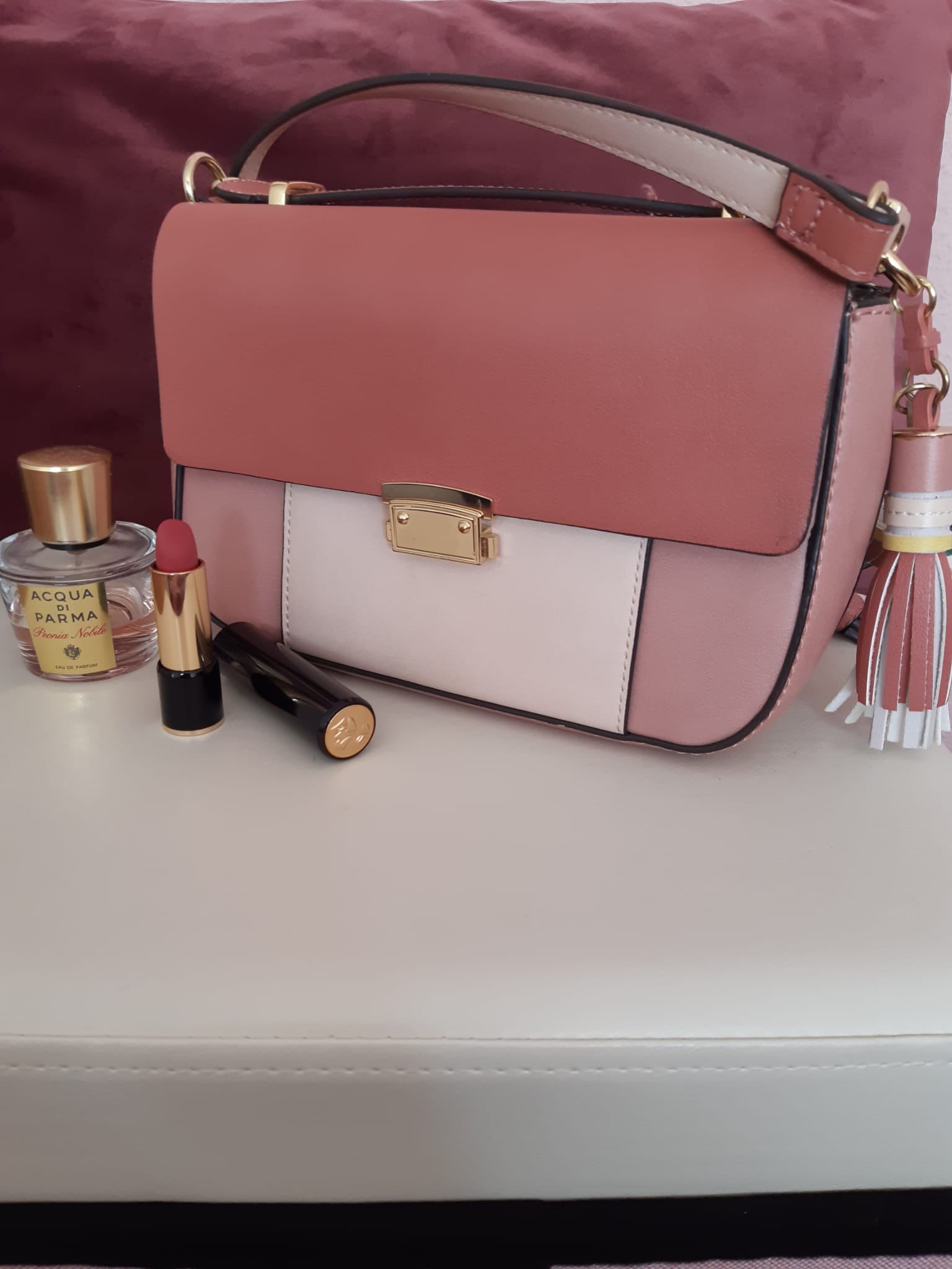 As we believe in second life for handbags, this medium-sized pink bag is perfect to hang over the shoulder. It has several zippered pockets and a gold closure. It is from the Parfois brand.